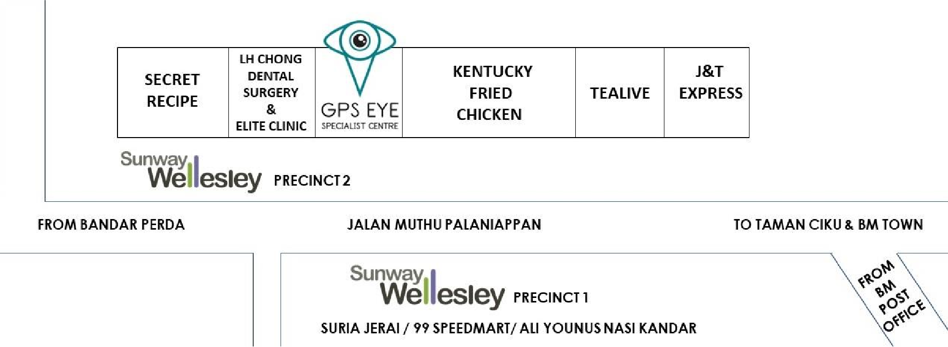 GPS Eye Specialist Centre is strategically located at Sunway Wellesley (Commercial Township Precinct 2) in Bukit Mertajam, Penang (Seberang Perai Tengah). Located at just a stone’s throw away from the bustling Bukit Mertajam old town, the main-road facing centre is conveniently linked to various amenities and major transportation routes. With provision of ample parking space including OKU-friendly bays and ramps, parking is a breeze. From afar, the centre can be easily spotted as its façade resembles the alphabet E in vision chart.