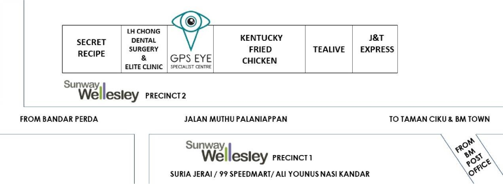 GPS Eye Specialist Centre is strategically located at Sunway Wellesley (Commercial Township Precinct 2) in Bukit Mertajam, Penang (Seberang Perai Tengah). Located at just a stone’s throw away from the bustling Bukit Mertajam old town, the main-road facing centre is conveniently linked to various amenities and major transportation routes. With provision of ample parking space including OKU-friendly bays and ramps, parking is a breeze. From afar, the centre can be easily spotted as its façade resembles the alphabet E in vision chart.
